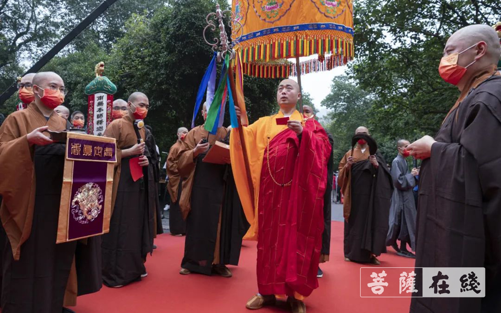 上午8点30分,升座法会正式举行。耀智法师一行前往杭州佛教安养堂,代表两序大众恭迎圆诠法师到上天竺法喜讲寺晋院升座。