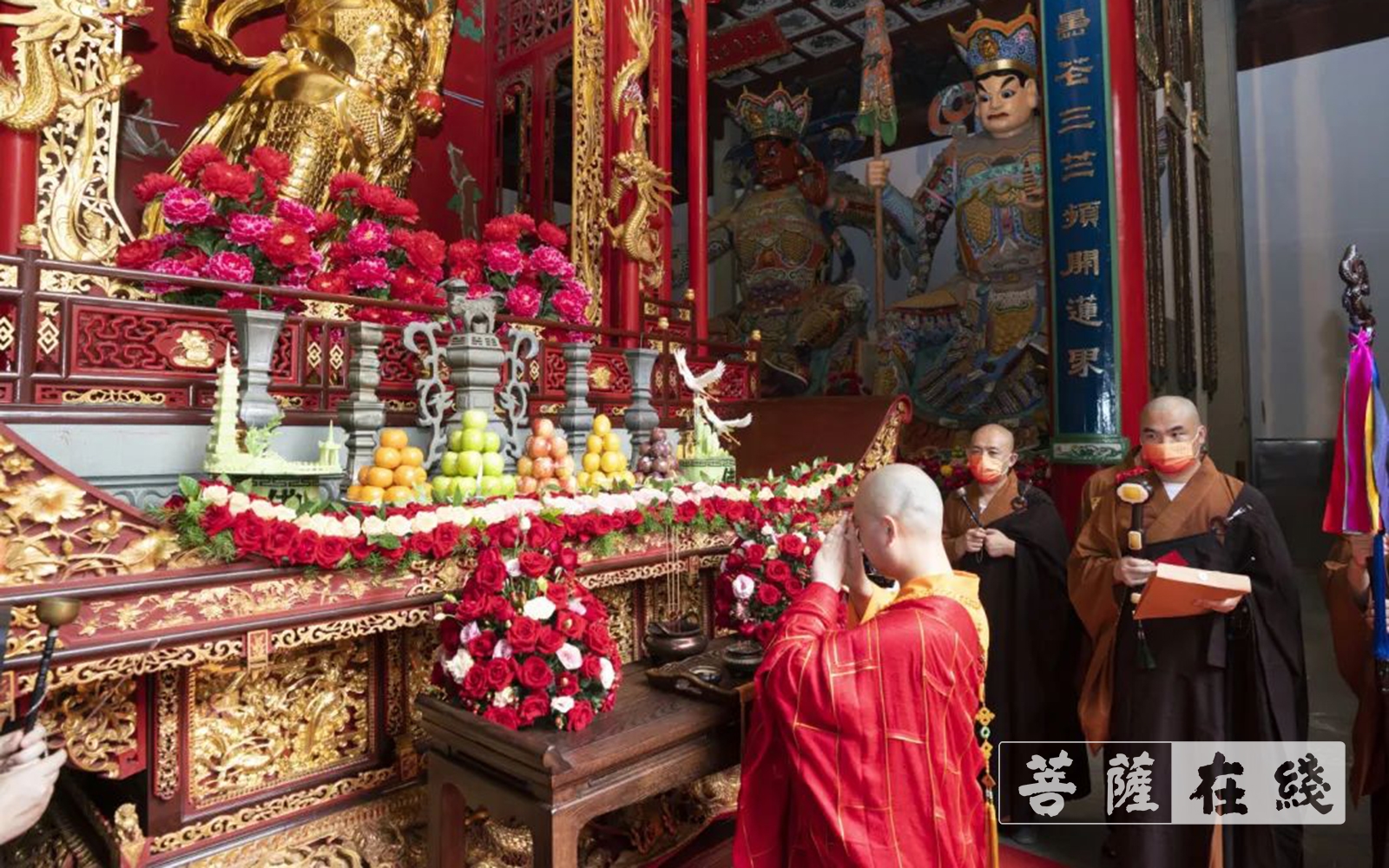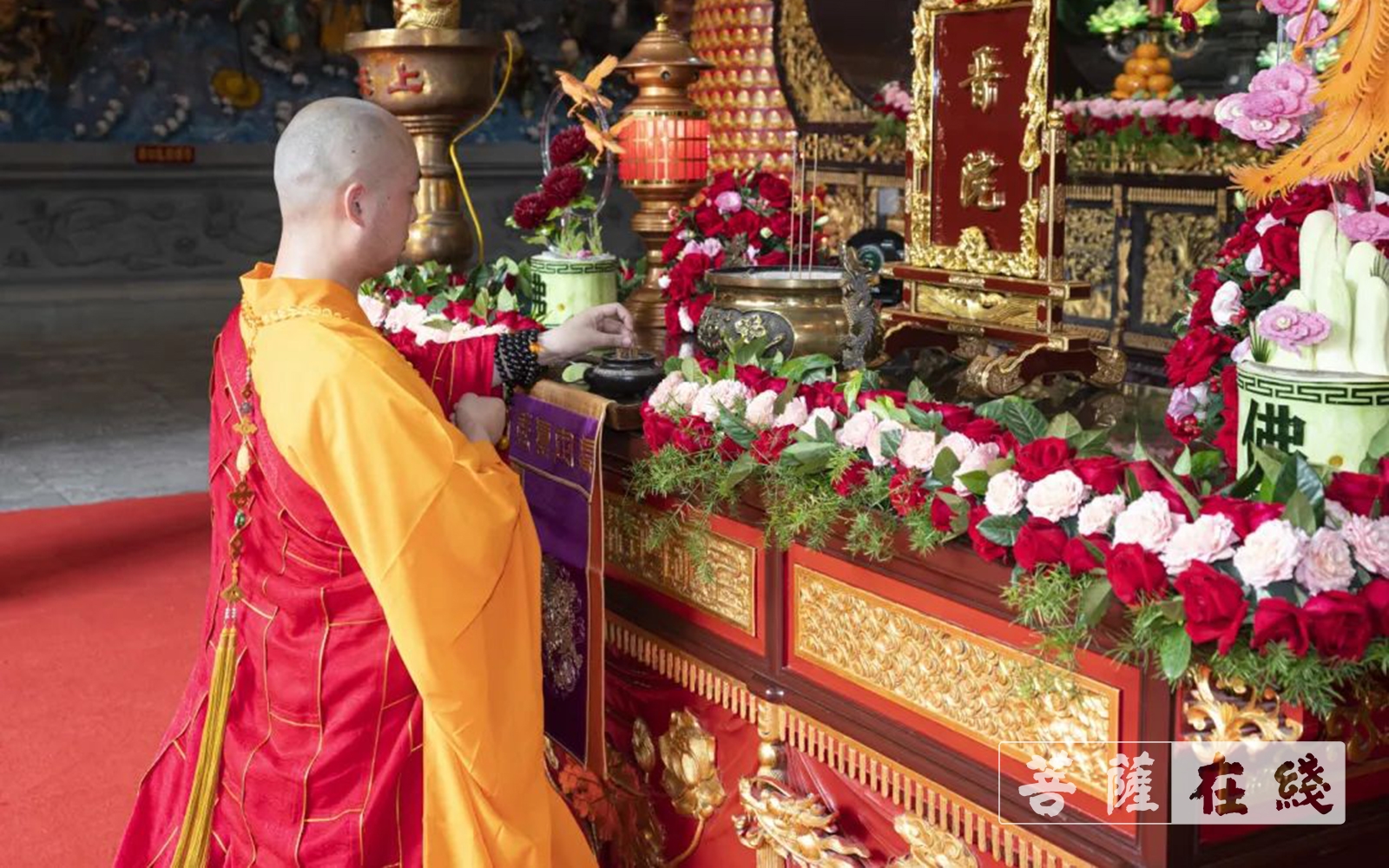 圆诠法师随后分别在天王殿、圆通宝殿、大雄宝殿菩萨像前拈香、说法,展具三拜。