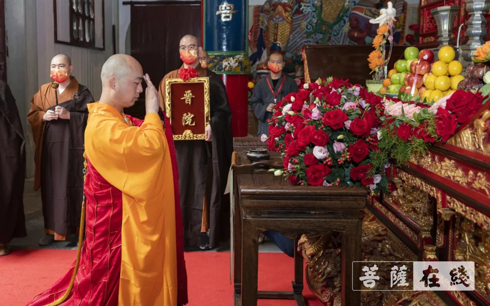在大雄宝殿释迦牟尼佛像前,中国佛教协会副会长、普陀山普济寺方丈道慈大和尚为圆诠法师送位