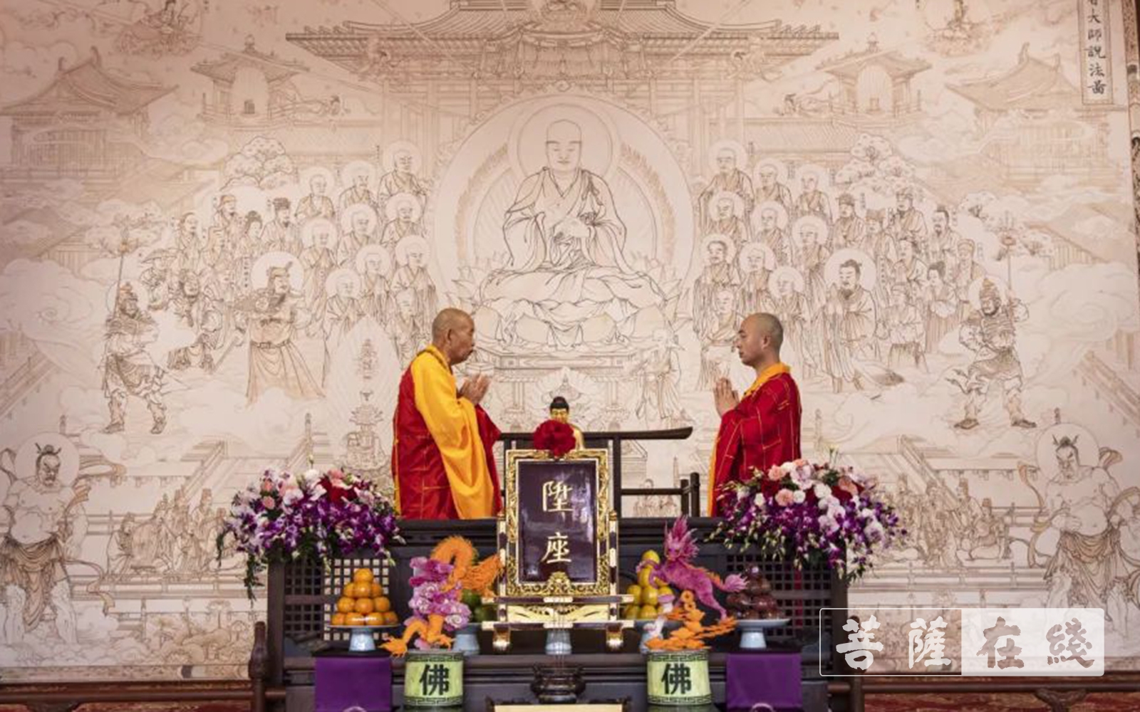在法堂内,杭州上天竺法喜讲寺定本老和尚为圆诠法师送座