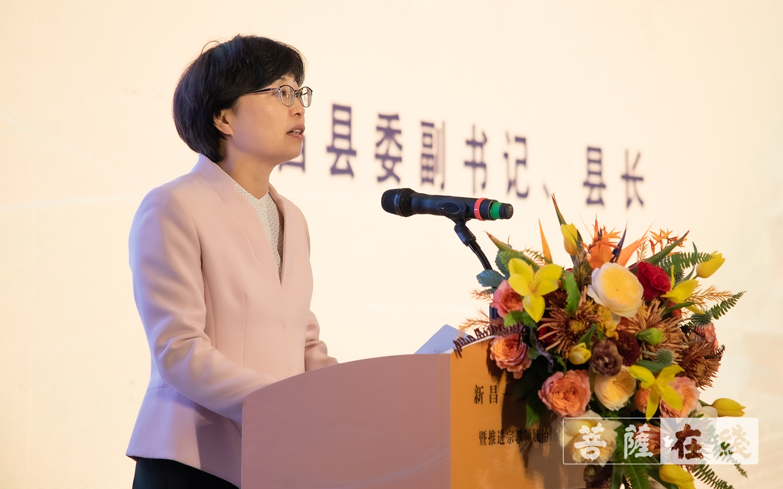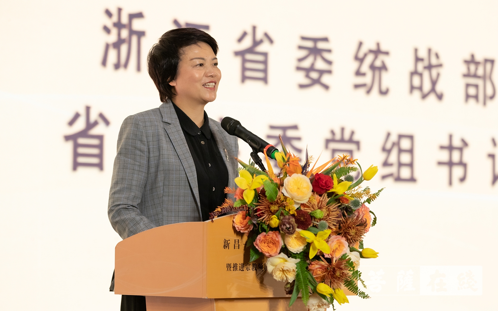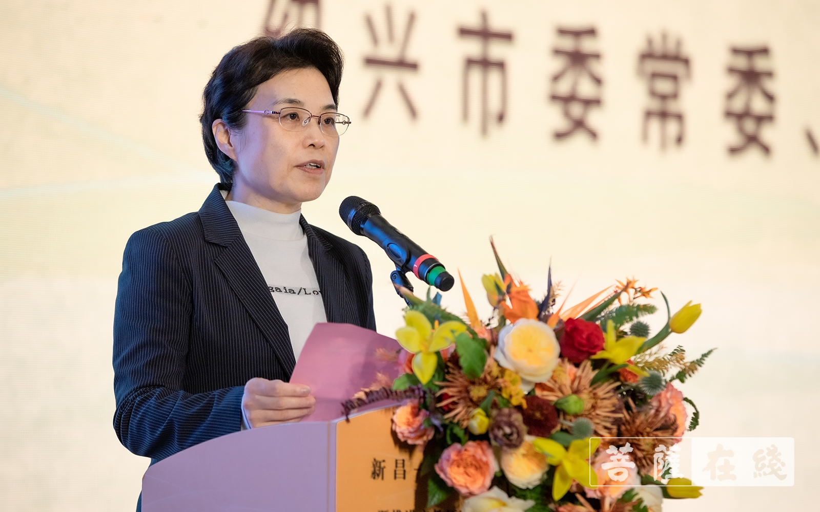 浙江省委统战部副部长、省民宗委党组书记、主任鲍秀英指出,“中国文化复兴佛教当担大任”,要当此大任,就必须与时俱进发展适应社会现实和时代需要的佛教文化。新昌县在佛教文化的传承和弘扬方面,做了很多积极的探索实践,尤其在佛教中国化课题研究方面取得了显著成效。她强调,坚持佛教中国化方向,要坚持与时俱进,坚定文化自信,彰显本土特色。她希望新昌发挥佛教中国化重要发祥地的作用,成为探索建设富有时代气息的佛教文化热土,服务浙江高质量发展和共同富裕示范区建设(图片来源:菩萨在线 摄影:果然)