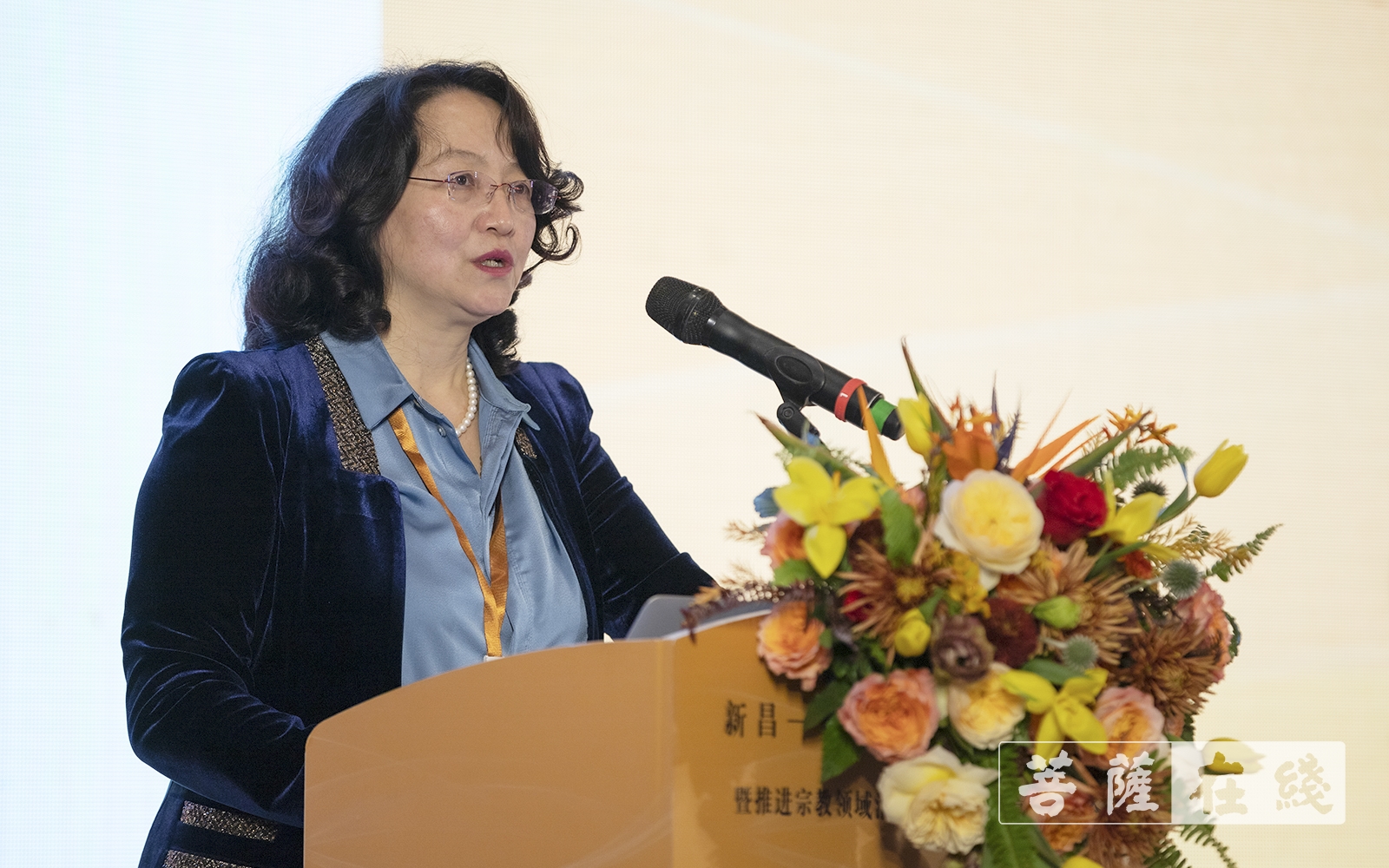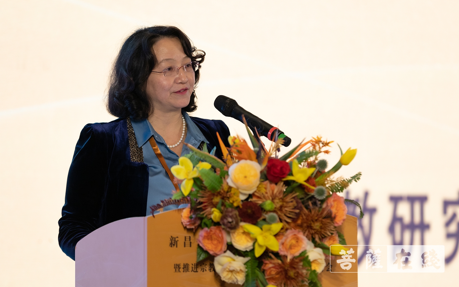 研讨会上,郑筱筠作《历史必然性与文化创新性—坚持我国宗教中国化方向的理论逻辑级实践路径》主旨发言,她阐述了我国宗教中国化方向的理论逻辑及实践路径(图片来源:菩萨在线 摄影:果然)