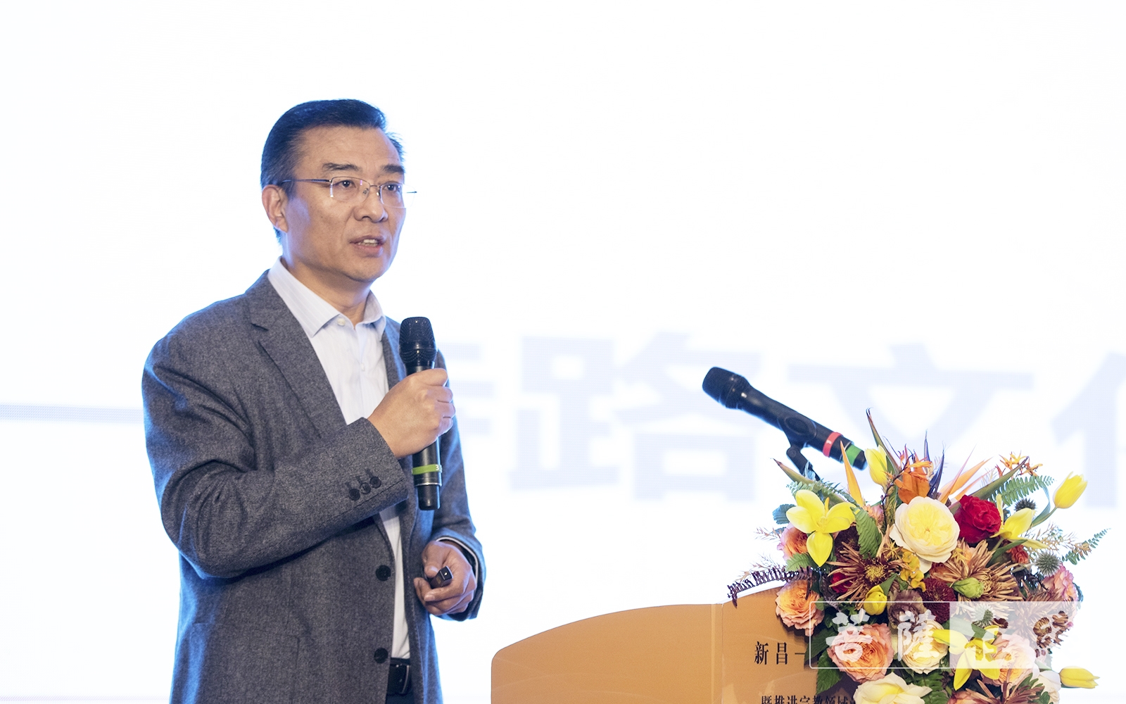 中国计量大学人文与外语学院院长、教授,唐诗之路研究会副会长兼秘书长邱高兴作《诗与远方—诗路文化带中的新昌佛道文化》主旨发言(图片来源:菩萨在线 摄影:果然)