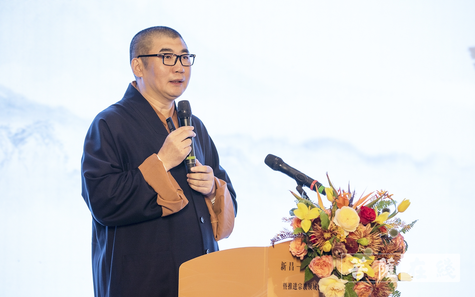 全国政协委员、中国佛教协会副会长湛如法师作《浙江新昌与佛教中国化—以律仪规范及制度建设为中心》主旨发言(图片来源:菩萨在线 摄影:果然)