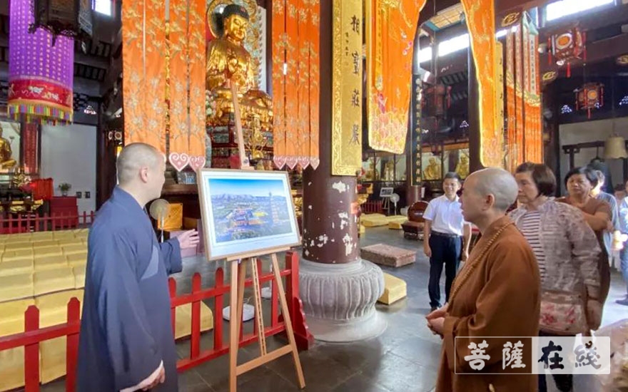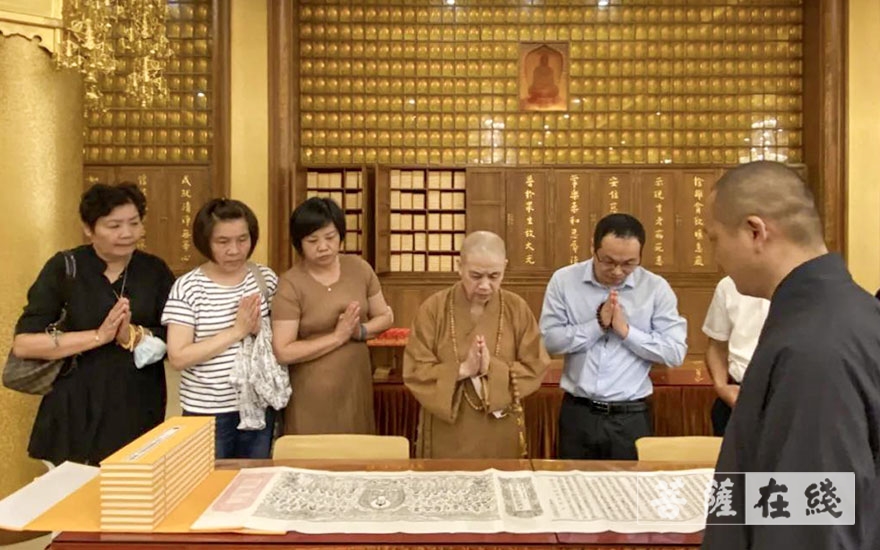 在宽智法师陪同下,参访团一行参拜各个殿堂,了解了寿圣寺的历史沿革、自身建设发展及日常寺务管理方面的工作情况,并接受圆成长老生前手书《法华经》的影印本。