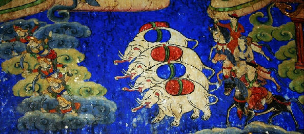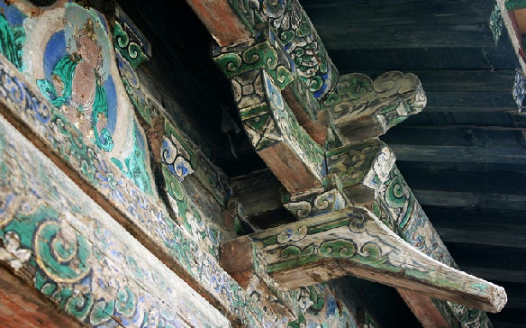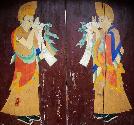 2、金刚殿:也叫转轮殿,正中从梁上到地下安装有高二米余,直径一米余的八角转轮一座,四面镶有拉环,供人拉转,西侧塑四大金刚像。