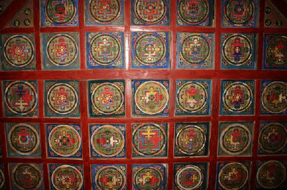 7、大经堂:座西面东,内宽24米,长28米,重檐歇山顶,顶棚为三百七十六块绘画方格天花板,画栋雕梁,宽敞别致,别具风格。内供宗喀巴像,堂中设活佛讲经座床。南北廊下柱空间设有支架小转轮25个,供转寺的人们拉转。