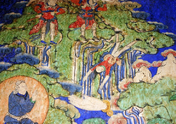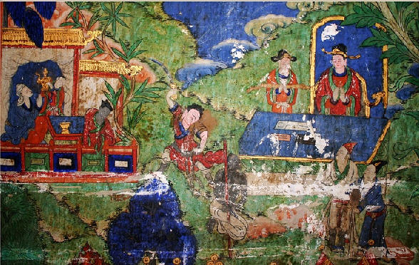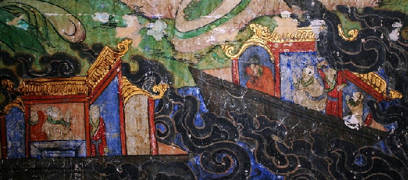 3、万岁殿:正中莲台塑释迦、交殊、普贤三大菩萨像。供桌上原供有朱元璋画像,设有木制"当今皇帝万岁万万岁"牌位,供土司朝拜之用。殿后座南朝北塑有观音人像,又称四臂倒坐观音。四周穿廊画壁上,绘有释迦牟尼生平故事,形象生动,工艺精致。