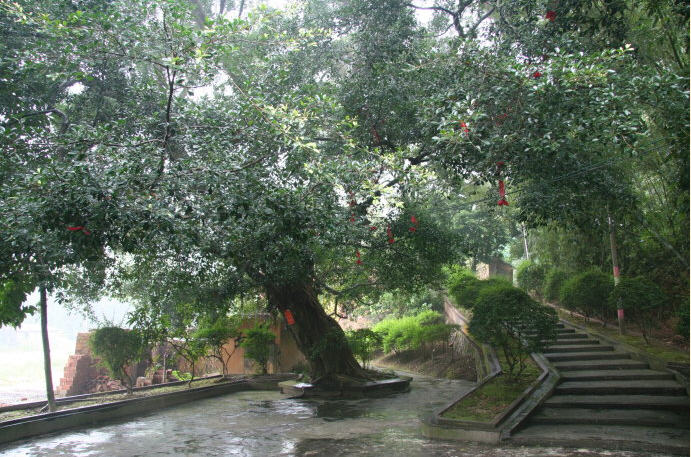 这里紫云霭霭,香烟袅袅,古树参天,花香鸟语,清幽雅静。