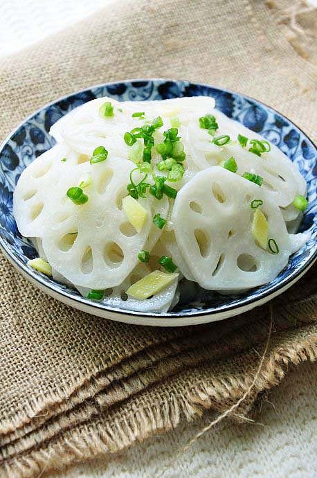 2、将藕放入加了白醋的水中浸泡5分钟,以免变色