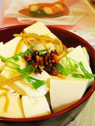 2.冷却的豆腐切成小块,放入调味汁,拌入红油金针菇,撒上鲜菜末即可。