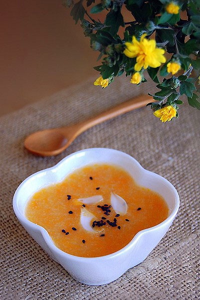 【用料】南瓜250克 糯米100克 新鲜百合1个 冰糖 芝麻适量
