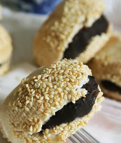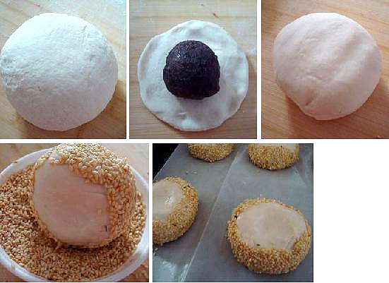 4、面坯周围一圈沾水,再沾满芝麻(收口朝外,即收口处也会沾满芝麻,这样烤焙时收口会裂开)