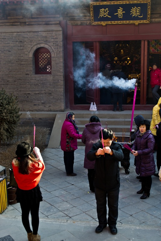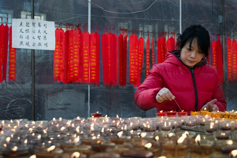 正月初一,朝阳关帝庙一位游客点燃祈福的佛灯 。