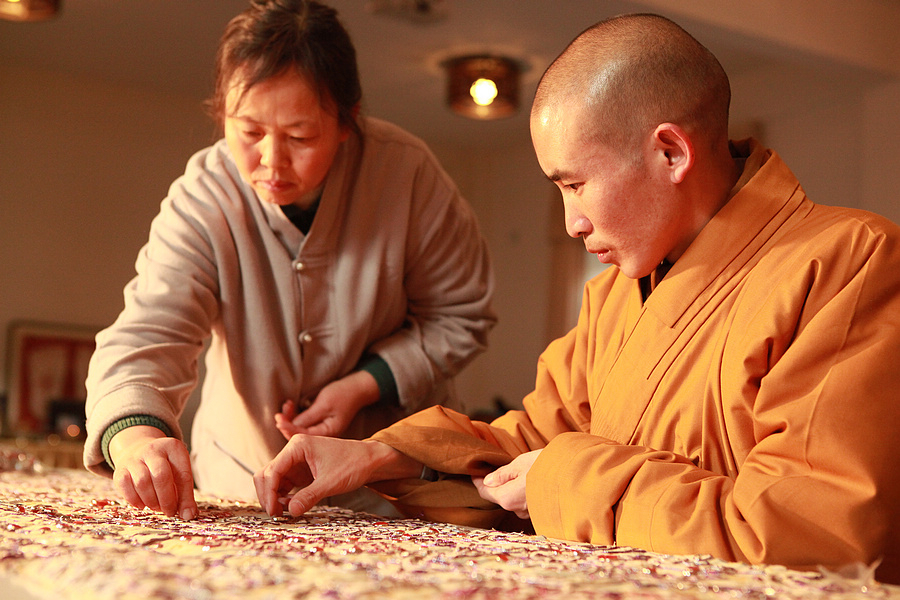 拍于寺内绣品坊,师父和居士在聚精会神的工作。