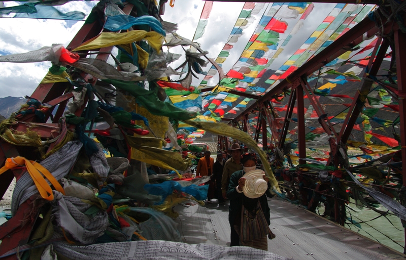 这是去楚布寺朝拜的必经之桥,由于年久失修,每次汽车经过时,为了减轻桥的压力,必须全体乘客先下车步行过桥,藏胞们为了祈祷桥平安,在桥上挂满了经幡