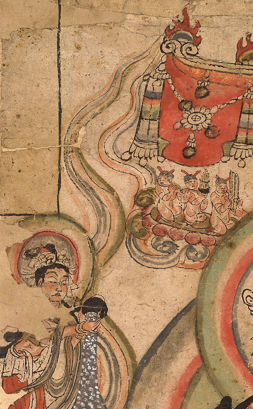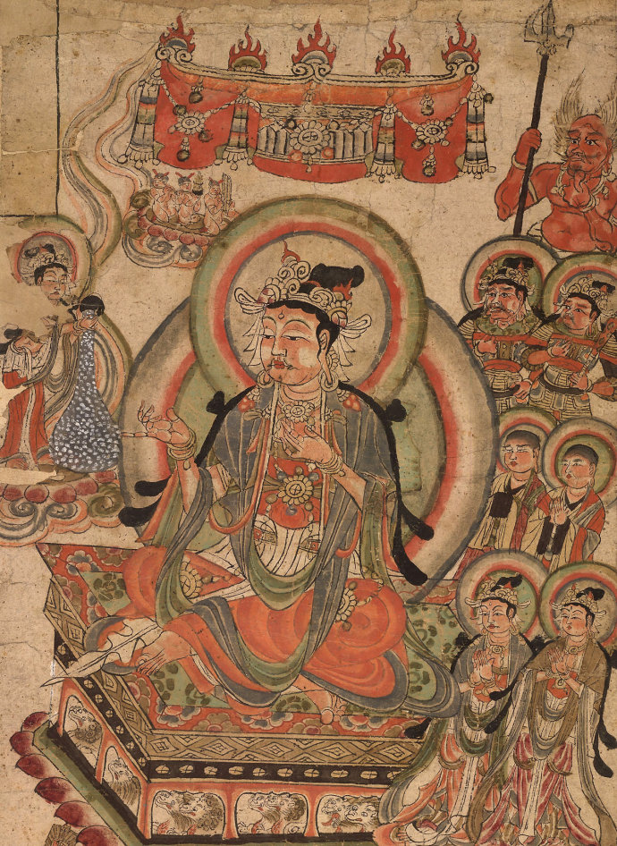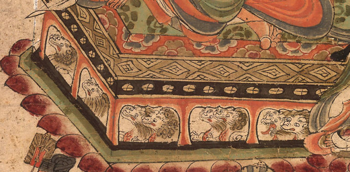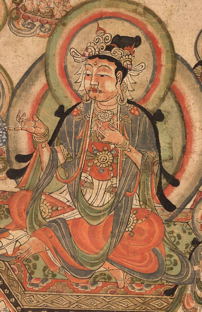 本图仅见文殊菩萨,可能与其相对的左幅位置,描绘着维摩手持扇子,横卧床上的姿容。