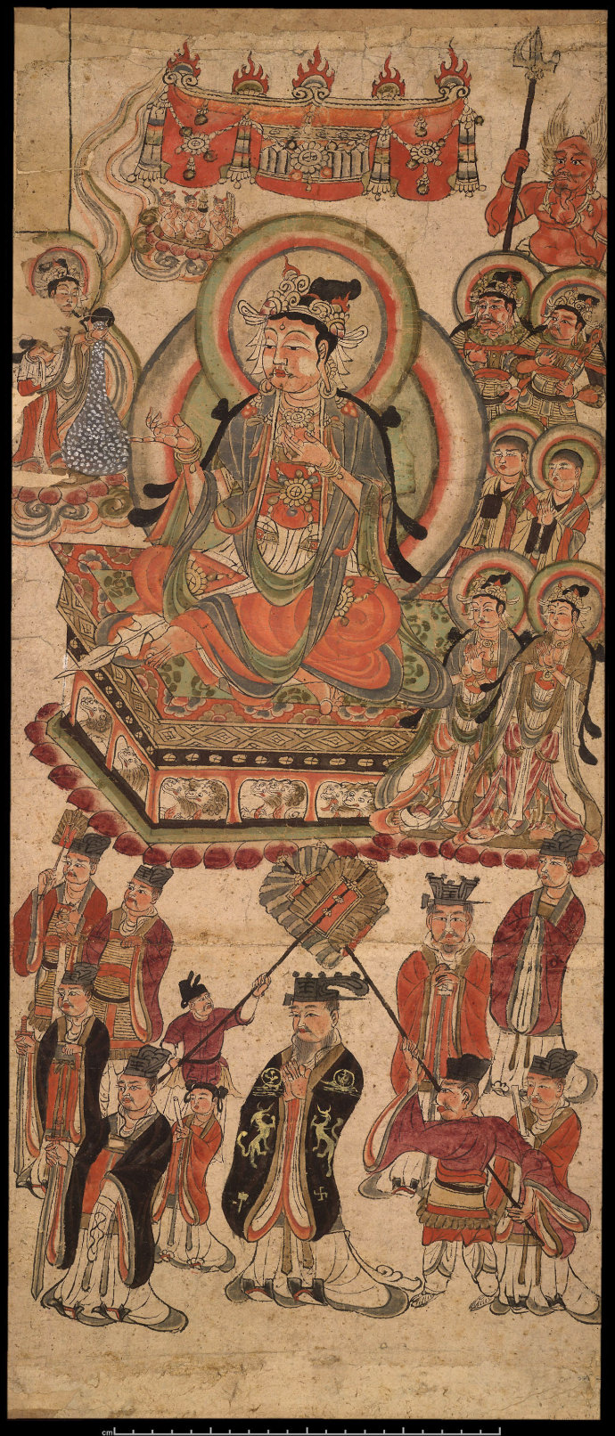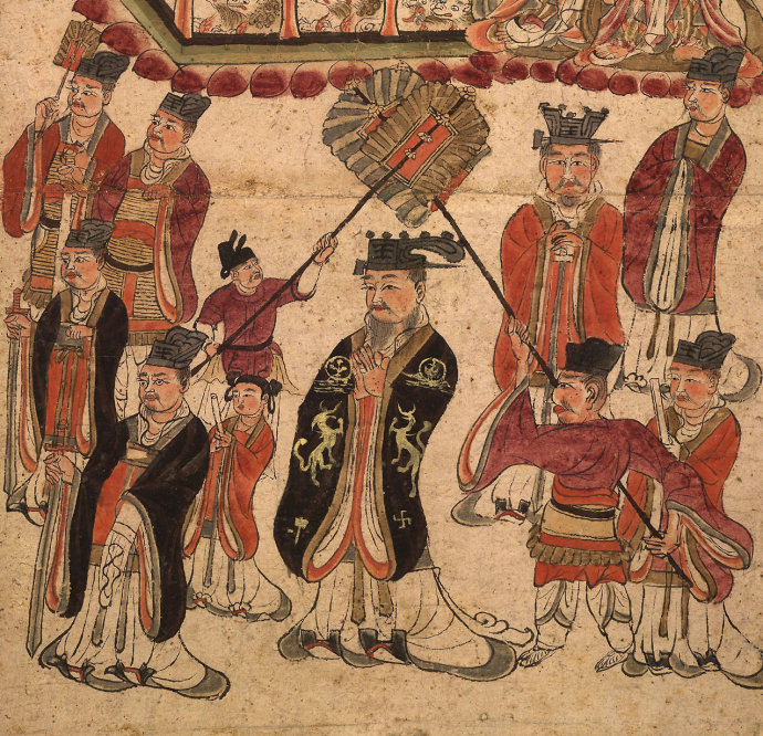 图此图下方有一国王身着龙和日月文样的华丽礼服,在众眷属和侍者围绕下前来听法。