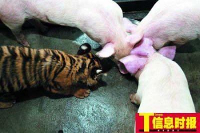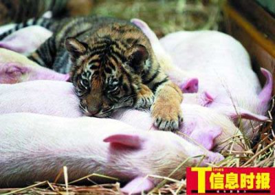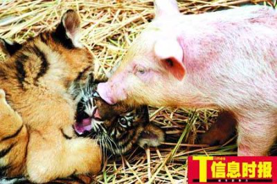 据信息时报报道: 世界上的缘分总是很奇妙!昨天,记者在香江野生动物世界就碰到这样奇特的缘分:三只被“虎妈妈”遗弃的小虎被一只“猪妈妈”收留,而且三只小虎生长得非常健壮,和其它猪兄弟相处融洽。