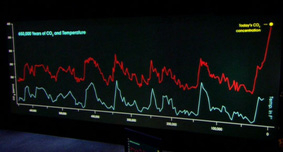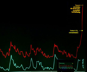 追溯过去的65万年,虽然经历过多次的冰河期和暖化期的交替,但大气中二氧化碳的含量,从没有超过300 PPM(PPM为百万分之一)。而2004年,联合国气候公约的执行秘书亨特女士,公布大气中二氧化碳的浓度已达到了379PPM,大大超过了人类社会工业化前的280PPM。而且在过去10年中每年增长1.8PPM。 按现有的人类生产活动,大气二氧化碳含量在未来的几十年内还会一路飙升。我们用下图来说明: