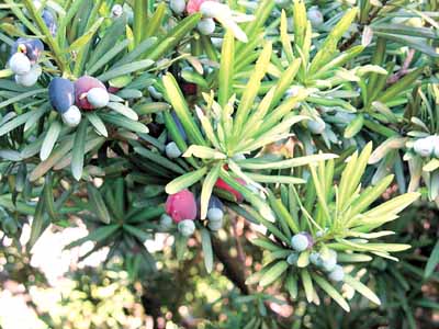 马先生告诉记者,这棵树已经种了十几年了,以前结的果实都只有绿色的那部分,今年突然就结出了这样的“人参果”。记者留意到,旁边的另一棵罗汉松的果子确实没有紫色的下半部分。