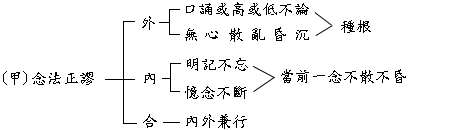 念佛的方法有正有谬,平素必须留意、警觉。一者“外念”,如平日数珠念佛即是。此种念法,声音或高或低均可,只是切忌“有口无心”。如果口诵佛号,心中却落入二种烦恼(即散乱、昏沉)当中,这样就没用处了,只是种种善根,增添福报而已。二者“内念”,即念佛时,内心要明记佛名、佛相、佛之功德而不忘。世人总是不忘饮食,念佛若能像这般念兹在兹,成就决定可期。再者,念佛除了当下明记不忘之外,如果能再加上忆念的工夫,则效果更佳。因为若能忆念不断,就能时时照顾念头,如此一来,即无昏沉、散乱,这是念佛的妙诀。不过,话虽如此,照顾当前一念毕竟不易,故劝诸位内外合行,口出声加心内念,互相调剂,如此轮替,自得净念相继。