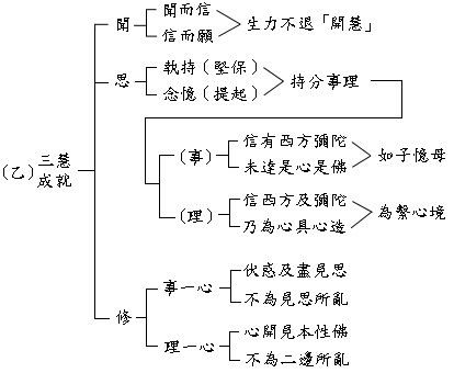净宗之“闻”,特重“信”字,一闻即信。信而愿,有信愿就能开慧,就不会退转。信后研究求解即为“思”,“思”即明记不忘、忆念不断,可就事理两方面探讨,意即念佛有“事念”、“理念”之别。若不懂佛理,但信西方有极乐世界、阿弥陀佛,便“如母忆子”,一心念去,此即“事念”。若知极乐、弥陀为自心所造,念弥陀即念自性,生极乐即生自心,此即“理念”。知“事念”,便可得“事一心”,虽然见思未断,然能伏住,带业往生。