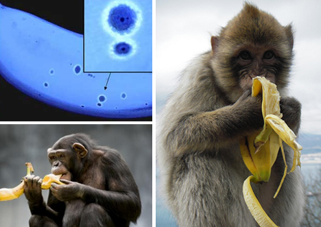类人猿似乎总是香蕉不离手,但是你知道这些家伙不用尝就能敏锐的知道过时在何时已经成熟,非摘不可么?研究表明:熟透了的香蕉会散发一圈蓝色紫外光线,这就是告诉类人猿果实成熟的信号。科学家甚至可以推而广之,类人猿可以辨别短波长光,并以此来判断果实是否成熟。