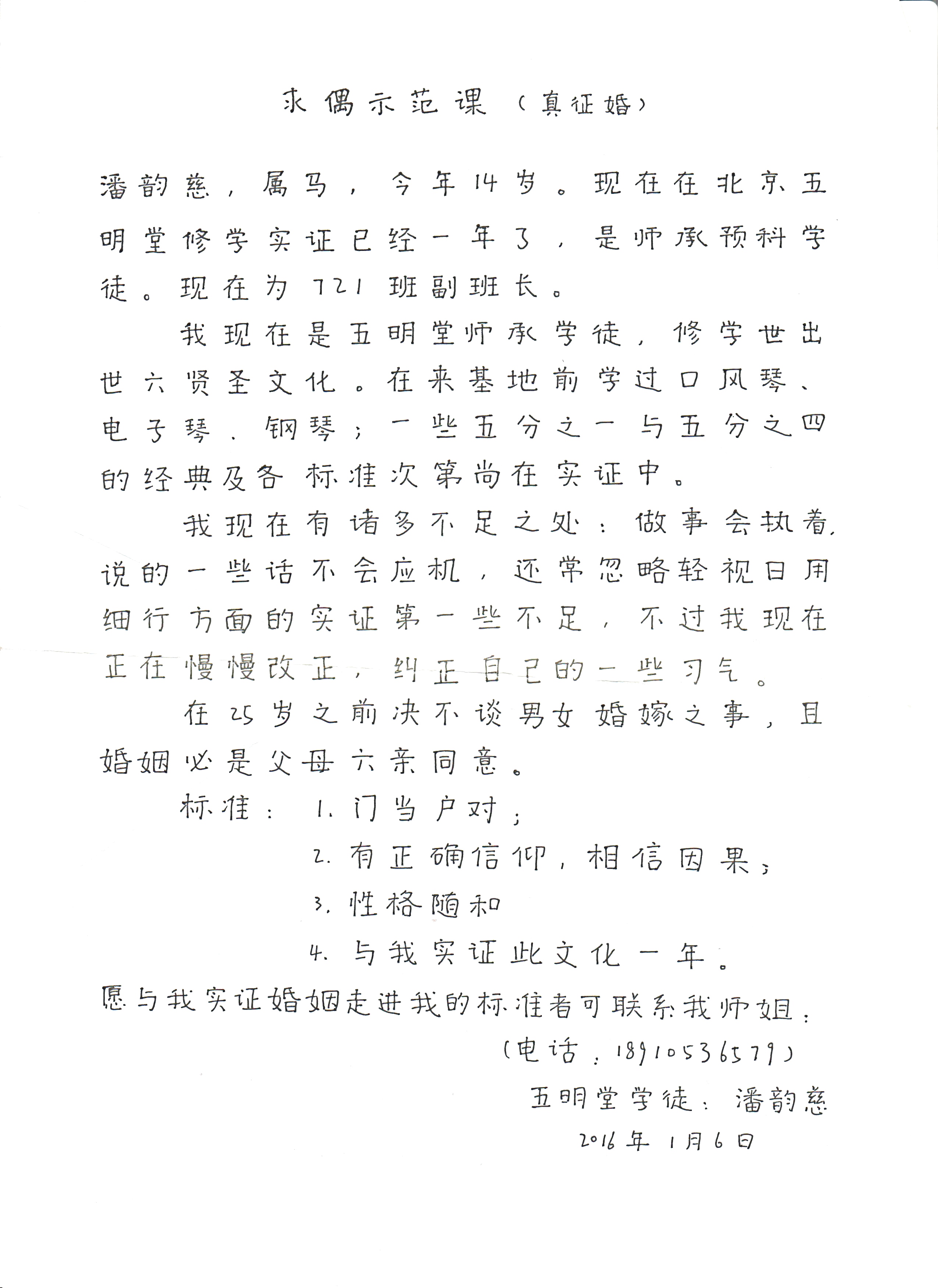 男不满二十二周岁,女不满二十周岁,不符合法定年龄,不经六亲、基地同意,不可在基地谈恋爱。若有违反则自负世出世法律戒律责任,退出五明堂。