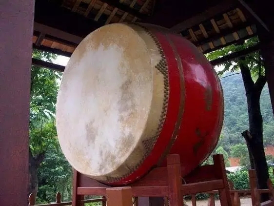 鼓:有羯鼓、鱼鼓、云鼓、摇鼓、金鼓、石鼓、悬鼓等。依其用途可分为:斋鼓(食时所用)、浴鼓(浴时所用)及诵经、梵呗等所用之鼓。今之寺院,常见于大殿前的左右两方建钟鼓楼,分别安置钟、鼓,称为“左钟右鼓”。寺院每于晨昏击钟敲鼓,以警行者当勤精进,慎勿放逸,称为“晨钟暮鼓”。