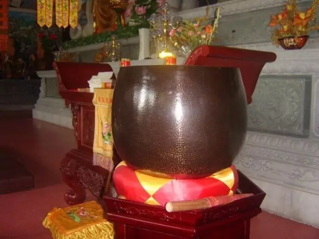 大磬:以铜铸造的盂形法物,置于佛桌右侧,法会、课诵时,引导一切唱诵的起落,由维那以棓 ( 木制之棒 ) 击鸣。凡住持或尊宿、仕宦等礼佛,皆鸣三下。