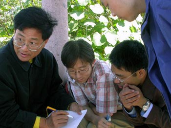 2004年10月15日,上海交通大学讲师晏才宏(左一)已得知自己身患肺癌晚期,仍平静地给前去看望他的学生讲解难题。(新华社发)
