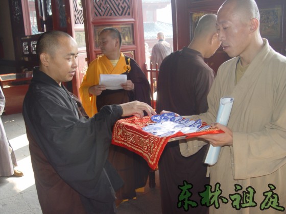 2005.10.09晚,东林助念团预备会在研究生班教室召开。会上本通法师和觉海法师都进行了开示,缘了法师按报名表点名,让大家互相认识。 最精彩的是缘了法师最后讲的他父母临终的事例。他父亲一生不偷盗做的很好,临终很安详,在得到助念后,脸上的安详笑容竟然感动了几个原本不信佛的子女,最后虚探老人顶部,觉得灼热。可证往生无疑。缘了法师的母亲临终时原来是恶相,在得到助念后,面色由青转粉白,嘴由歪转正,由于没有牙齿而瘪下去的腮也鼓起来。足见佛的慈悲加持。 觉海法师自言原来修密,不屑净土。但亲见了两个事例,对他转变很大:一个是98岁的圆通老和尚,一生勤俭,民国时期的瓶子居然还用着,平生得到的百万供养都作了布施。临终预先告假,为大家开示到10点。凌晨两点多,安详卧着去世。还有一个事例是觉海法师在天津为一位师弟助念,助念到10多个小时,亲见一缕比香烟更浓的白烟,从师弟头上冒出,结成白莲,飘窗而去。 2005.10.10上午9点,东林寺助念团在东林寺大雄宝殿举行成立仪式。首先是:香赞、心经、往生咒,然后由助念团团长本通法师讲解缘起,助念团导师大安法师进行助念团意义的开示,团长代表所有成员接受导师授予的团徽,缘了法师领众发愿,最后大众回向。 大安法师讲了很久,其中令人印象深刻的是他本人信佛前的一次住院,一位聊天的病友忽然术后大出血,就死了。当晚,他在病友停尸的太平间徘徊良久,觉得人生真是无常。心里就想,如何能摆脱死亡的痛苦?大安法师自言,此事对他日后修净土有相当大的影响。法师在开示的最后,说助念团会和将来的安养中心一起,把东林寺办成往生净土的中转站之一。 助念团组织机构: 助念团导师:大安法师