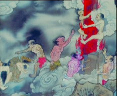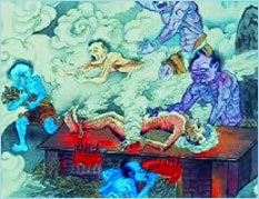 《经律异相》云:凡以恶心毒害众生,以刀叉、铁叉、鱼叉刺害水族类,或捕猎禽兽者,受此戟腹罪报。又此罪报,非仅戟腹而已,乃是遍身刺至血肉模糊为止,苦惨万分,风吹复活,反复受罪,痛苦难宣。 |