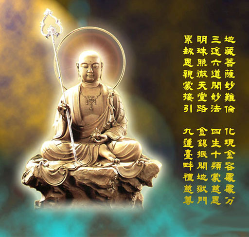 若有众生闻地藏菩萨名时,或合掌,或赞叹,或作礼,或恋慕者,是人超越三十劫罪。若有众生彩画菩萨,或作金、银、铜、石、形像,一瞻一礼者,是人百返生于三十三天,永离恶道。