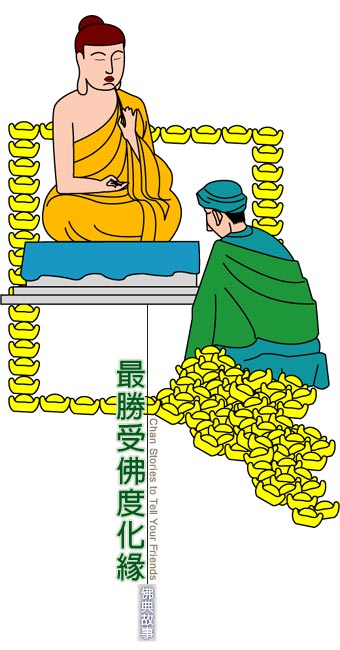 这一天,佛陀观察最胜长者得度的因缘已经成熟,嘱咐阿难前往度化。阿难立刻至长者家中托钵,并为其说法:“如果我们布施给贫穷困乏的人,就会得到五种功德。第一寿命延长,第二相貌端严,第三身强力壮,第四身心悦乐,第五辩才无碍”。长者听了后心想:“我听说瞿昙沙门的弟子阿难是多闻第一,所能诵持的教理超过八万四千亿头象所能背负的经典。然而今天,却只对我说布施的功德,这只能算是乞士之法,不过贪著我的财货而已,并不是真正贤明智慧的人所说的。”由于长者悭吝的习气十分坚固,就很狡诈的说:“不知道今天您已经有斋主供养,还是要继续乞食?”阿难回答:“正要去乞食。”长者说:“既然如此,太阳已经快到正午了,希望您别错过了时间。”此时阿难摇摇头,苦笑了一下,只得回去秉告佛陀:“这位悭贪长者的习气实在太坚固了,并不是弟子的德行所能度化的。”
