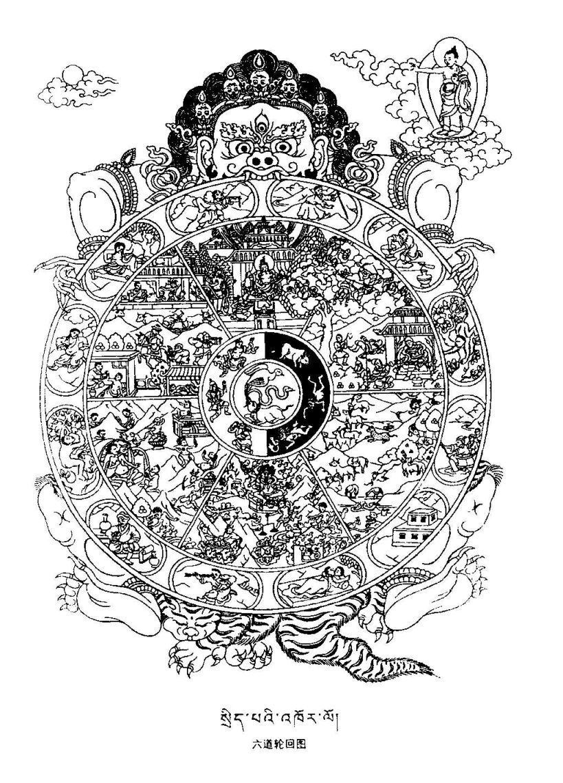 第五部分,生死轮的最外圈,画有十二缘起的表示图。十二个图各自比喻的意义,上文已经宣说过,此处不再重复。(见下面附录——编者注)