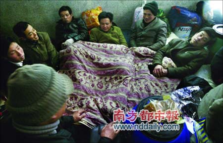 县民政局的记录显示,途经雷山的民工,滞留了1650人。县城小旅馆已经住满了人,在没有蜡烛的烟草招待所里,店老板用杯子盛着柴油自制柴油灯,他说,这几天生意好得不行,基本上都是休息一下又赶路的人,也有休息一两天的,因为他们要走更远的山路回家。