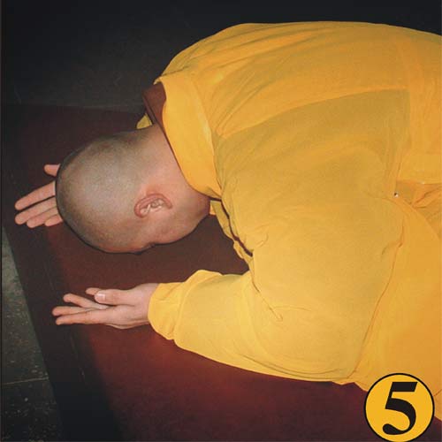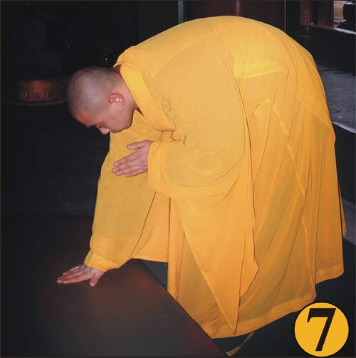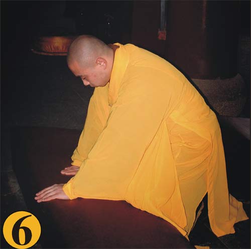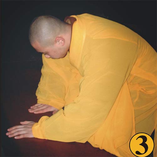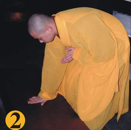 (二)分右掌向下,按于蒲团之中心,左掌不动,两膝跨开,跪于蒲团上