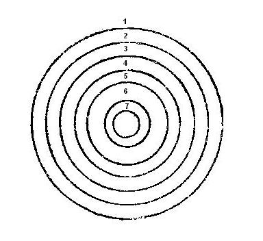 下图为七个次第之大小圆周所组成,每一圆周代表某一界次之业力圈。最外圈(第一圈)为最大的一个圆周,表示最普遍、最大之群体共同业力,此处姑称之为极共业圈。第二圈之范围较第一圈为小,其普遍度亦小,亦名之为大共业圈,如是业力圈之范围逐渐缩小,以至第七圈之最极不共业圈,代表个人之自我不共业,因为就最后之自我而论,是不与任何事物相共的。现在对这七个界次之业力圈及其相互之关系,逐一加以解说。