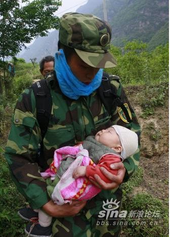经过一番努力,人们小心的把挡着她的废墟清理开,在她的身体下面躺着她的孩子,包在一个红色带黄花的小被子里,大概有3、4个月大,因为母亲身体庇护着,他毫发未伤,抱出来的时候,他还安静的睡着,他熟睡的脸让所有在场的人感到很温暖。