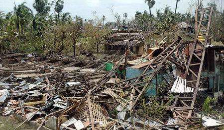 图为缅甸遭遇热带风暴袭击后的村庄一片狼藉。