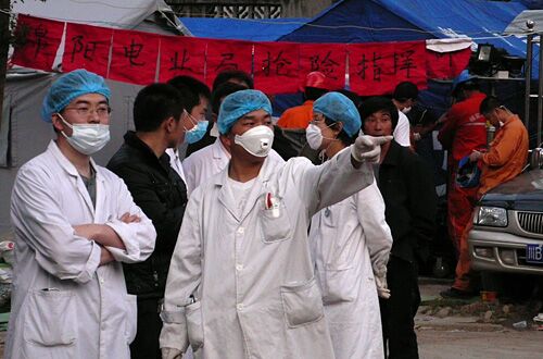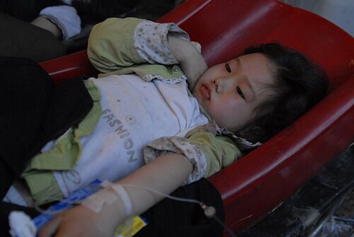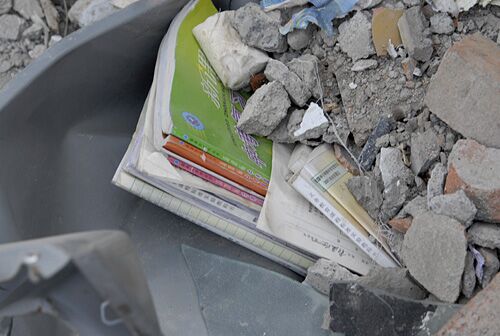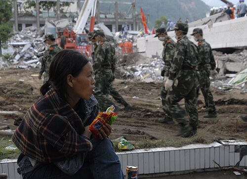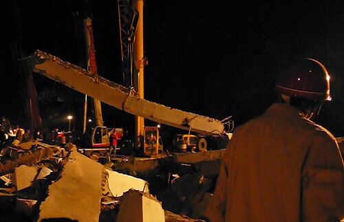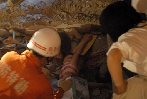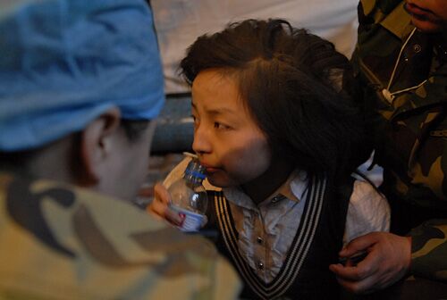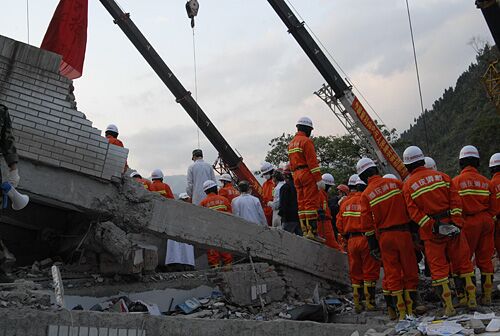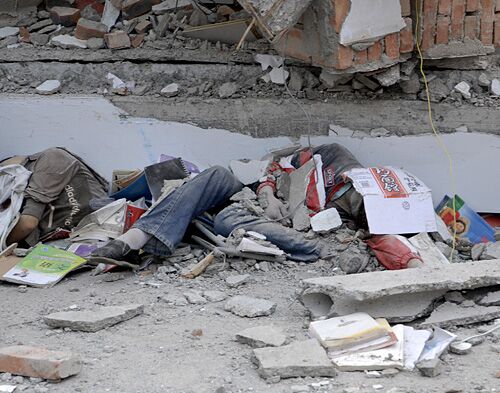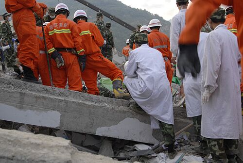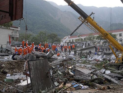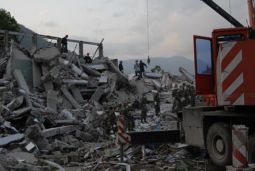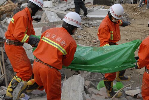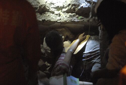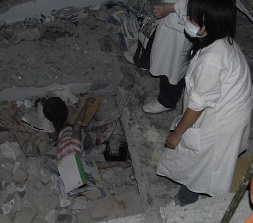 坍塌的教学楼 学生们的课本 救助官兵和医生在紧张搜救 废墟下孩子们的尸体 被挖掘出的孩子尸体 校园内一片狼藉,一栋五层的教学楼完全被地震夷为平地残砖断砾中散落着大量学生的课本和作业,甚至在废墟下还能不时看到孩子们被支离的尸体,现场情况惨不忍睹。 到处是急促奔跑的医生、救灾士兵、志愿者...... 来自重庆的援助医生,他们已经两天没有休息了,仍然站在倒塌的学校前,期望能够搜救出更多幸存的孩子,但一下午的时间,只搜救出三名幸存的孩子。现场有三台大型起重机正在把坍塌在表面上的水泥梁柱吊起,在这些被吊起的水泥柱面上还能清晰地看到孩子们留下的血迹。大量救灾战士在紧张搜救,他们争分夺秒,发掘那些被掩埋在废墟下的宝贵生命。救援官兵们,几乎每隔十分钟就会搜寻出一具孩子的尸骸。我们到达时已经距离孩子被掩埋已经超过四十八小时,以救援常识来看,孩子们的生还机率以分钟计在不断陡降。此刻才充分体现出时间就是生命。 就在我们被眼前的景象惊呆时,一个生命的奇迹在孩子身上发生了:几名官兵和医生抬着一个刚被抢救出的学生,来到临时医用救助帐篷。这个被救孩子是北川一中初二的女学生,她生命特征明显,甚至能清晰地告送医生,在她被救出地点不远处的水泥预制板下,还有三名同学在一直同她讲话。在这个临时生命的庇护所里还有另外两个女孩:一名也是北川一中初二的学生,另外一名是只有六岁的北川小学的孩子,她是上午从已被夷为废墟的县城里救出转运到这里的。她看上去很茫然,她根本无法去理解眼前所发生的一切。 被救出的北川一中初二学生,她的生命特征明显 年仅六岁的北川小学学生 在废墟上我们还看到两个被压着的孩子,其中一个已经无生命特征,另外一个的生命特征也非常微弱,一名医生和一名救险战士为了鼓励她保持清醒,为救助争取宝贵时间,就不停地和孩子说话。。。。。。 还被埋在废墟里的学生 救援官兵和医生在和这个学生喊话,让她保持清醒 夜已经很深了,但是来自全国各地的抢险救灾队还在努力搜寻掩埋的孩子们 今天的气温在二十多度,救援现场已经弥漫出一股尸体腐烂的味道,但是这丝毫没影响救助官兵和医生抢救进程,他们非常令人顷佩。 眼前的一切撕裂着扬帆计划项目组的心,我们无法用更多的语言去表达,我们唯有为孩子们默默祈祷,愿生命一直可以眷顾他们,别离开他们。。。。。。