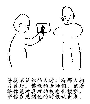 如果你必须找一个从未见过的人,认识那个人的朋友可以为你描述他,或给你一张照片。当然,你绝不会把相片当成真人,你会利用这张照片,在你碰到那个人的时候,就可以认出他了。同样地,佛教老师试着给你绝对真理的概念化模型,帮助你在见到它的时候认出它来。在试图沟通的时候,老师们有时候会说:“有智慧才能了解空性。”似乎空性是客体,而智慧是主体。试图解释,有时候只是徒增困惑,因为没有一个坚固的客体可以标明为“空性”,也没有一个坚固实存的主体可以标明为“智慧”。只要有主体、客体,就有二元对立——二元对立是自我的观点,不是空性见地。