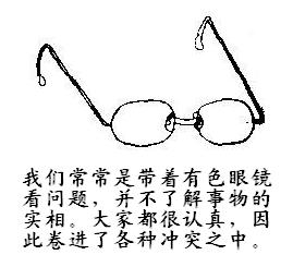 如果你能明白,你所看到的显现是由于你所戴的有色眼镜,别人所看到的显现是由于别人所戴的有色眼镜,大家都没有看到事物的真正面目,那么你与别人就会更和谐了。不幸的是,大部分的众生都不明白每个人都戴着有色眼镜,因此他们对自己所看到的都很认真,其结果是,大家卷进了包括战争的各种冲突之中。