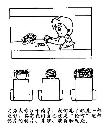 就好比去看一场强烈而又有力的电影,因为太专注于情节,忘了那是一场电影,把它当成自己的生活一般;有时候你陷得太深,甚至于看完电影的几个小时之后,还为电影的结局哭泣和忧虑。由于二元对立的成见,把自己和他人画出界綫,我们在“真实”生活中就是这样;忽略了,这是我们的作为,不一定是事物本来的面目。