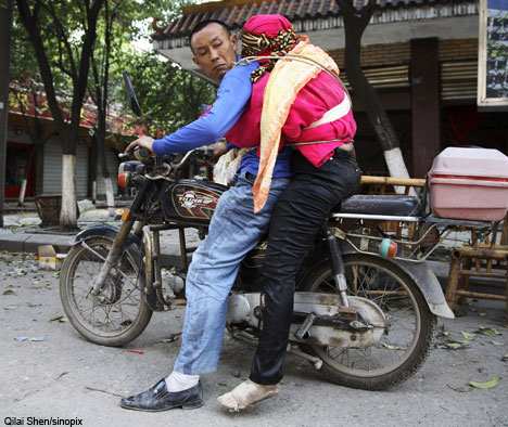 近日,英国《每日电讯报》刊登了一组图片,记录下中国抗震救灾过程中的一个个感人瞬间。在一张图片上,一个在地震中痛失妻子的男子饱含深情,不忍将亡妻弃之野外,将其身体与自己绑在一起,用摩托车载着她前往当地的太平间。在极大悲痛的折磨中,他努力要给妻子些许死后的尊严。英国媒体称,这是大毁灭后存在的人性象征。