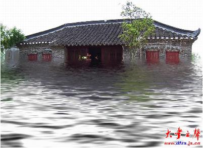 民国二十年大水效果模拟图(大水漫到离高鹤年大觉精舍屋檐只有一尺多一点)。 图片电脑合成:周旭才