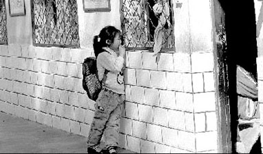 昨日下午2时许,记者赶到滨河路小学,听到上课铃声,学生陆续走进教室,而在一三班的窗户下,一个背着书包的小女孩告别和她说话的同学,双手抓住窗户上的钢筋,向教室里不停地张望着。经询问得知,小女孩叫郭晓晓(化名),是登封市少林办事处王庄村6组人,今年6岁,以前在这个班里上学,不知什么原因被清理了出来,不想离开学校、还想上学的她就只好趴在窗户下听课了。
