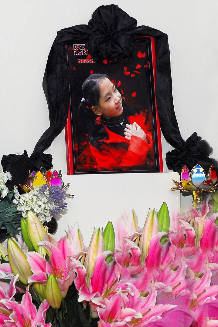 10月5日,也就是她离世的第五天,在追思会上,让雄拉姆(慈韵)安卧在鲜花丛中,脸色粉白,皮肤富有弹性,神态安详,宁静,无论怎样看都像是平稳地呼吸、熟睡。墙上挂的遗像是慈韵生前自己亲手制作的一张她最喜欢的相片。